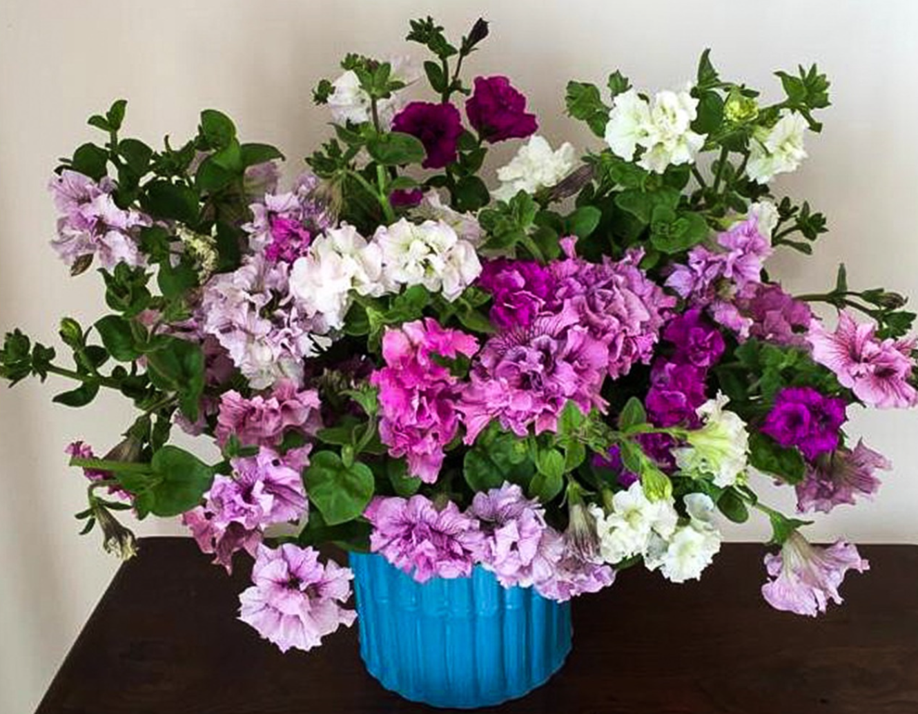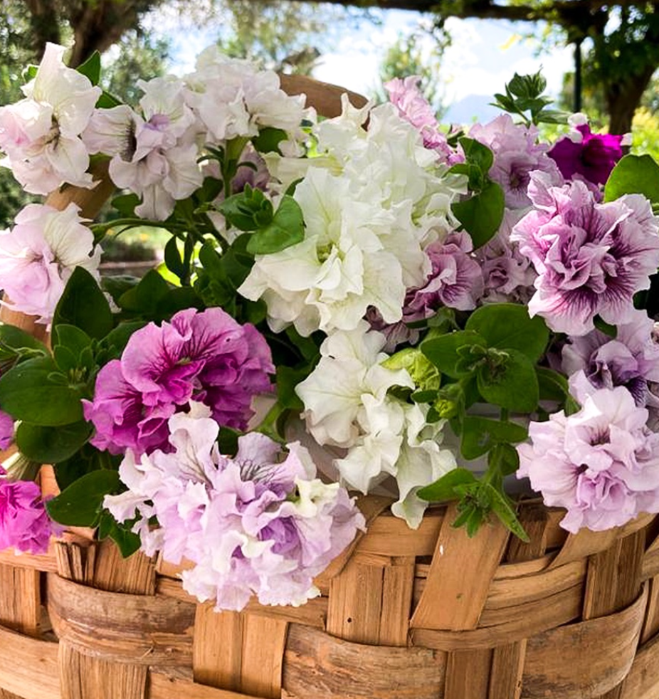 It produces strong and firm 30/50 cm stems carrying three to five beautiful double petunia flowers and many small and medium size buds which create a unique ornamental effect.
